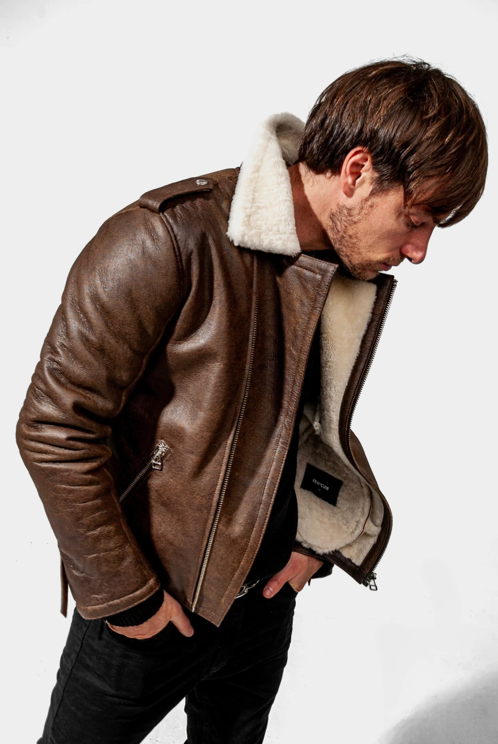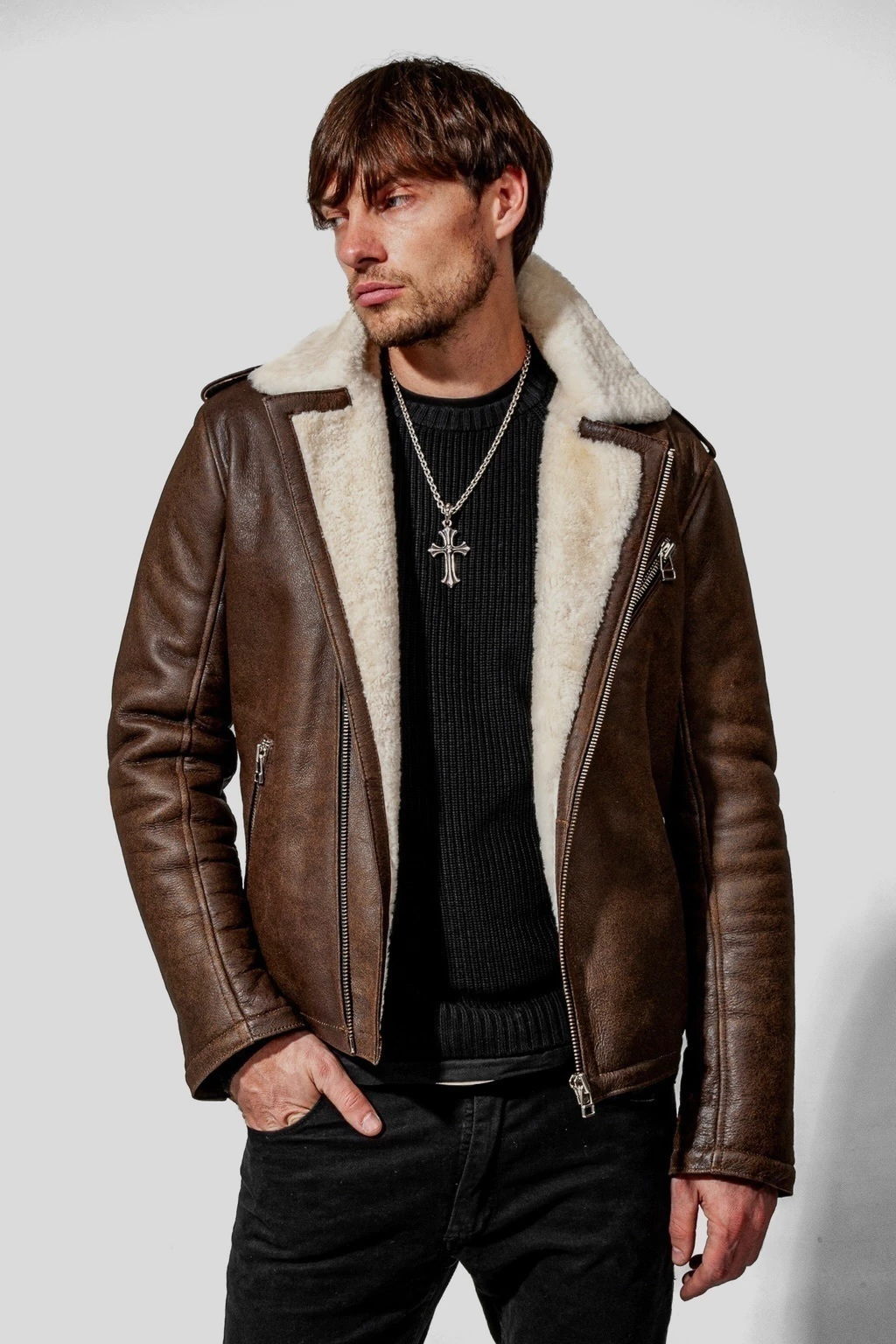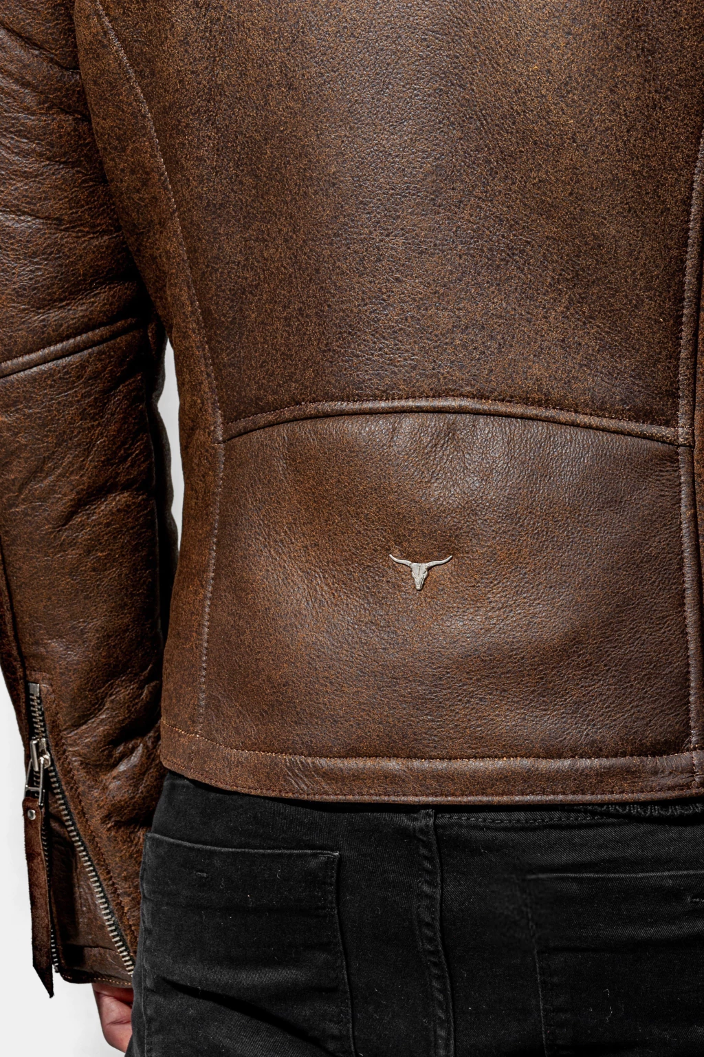Abrigo cruzado de corte slim fit con cuello y solapa de inspiración rocker. Confeccionado en 100% piel de borrego auténtico con acabado rústico, lana natural razada en el interior y cuero exterior napalizado; impermeable, resistente a la lluvia y al viento.