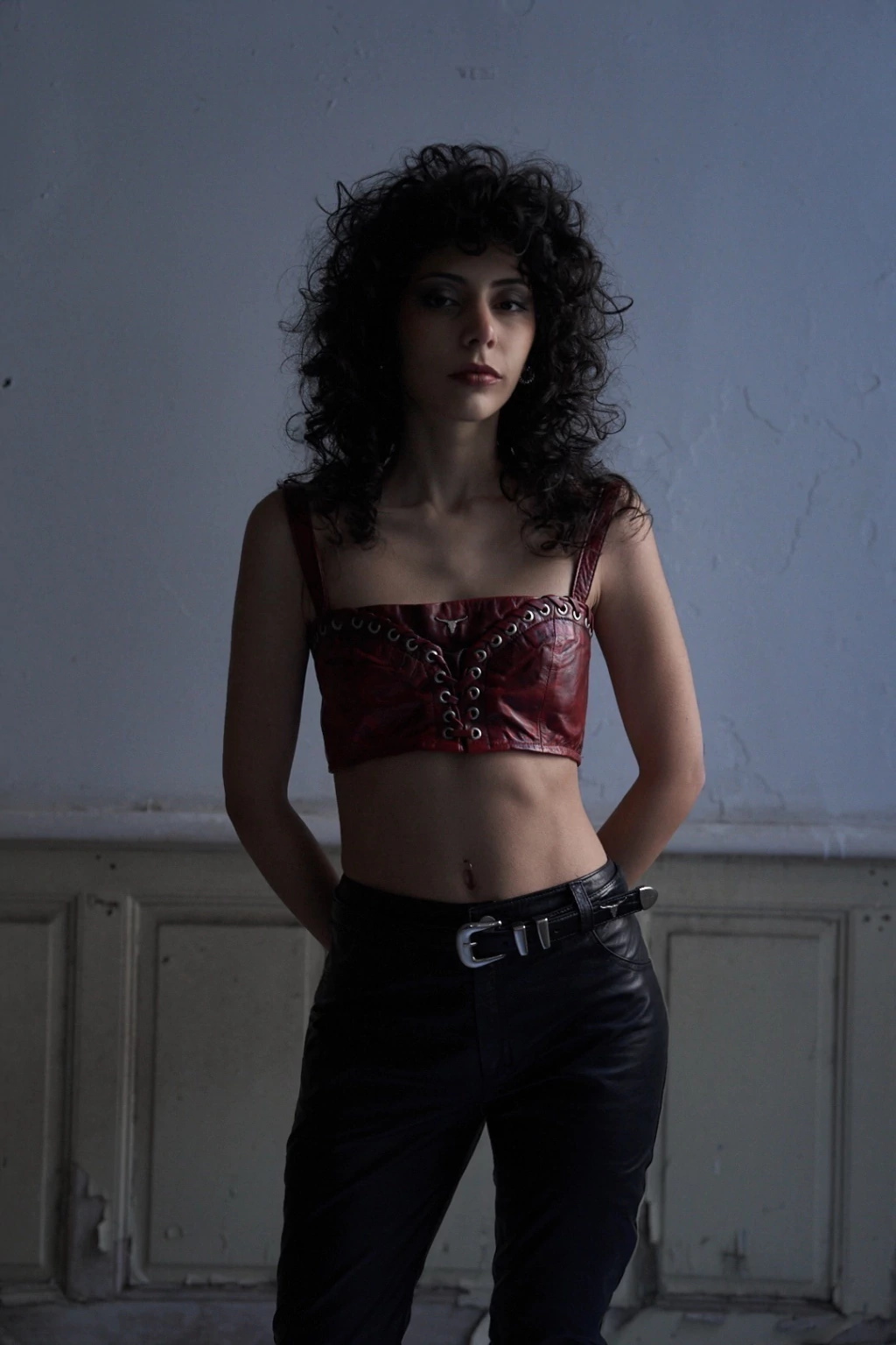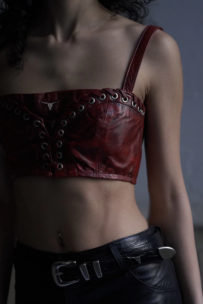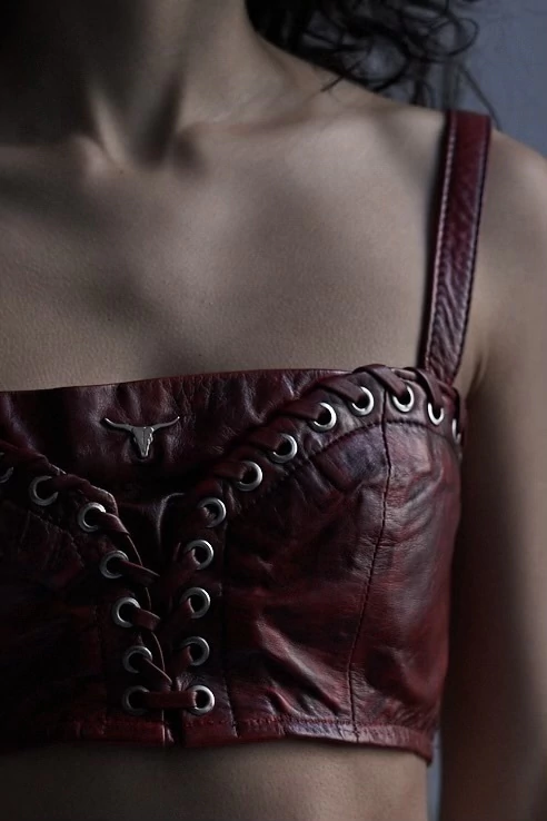Top corto rocker de cuero autentico intervenido a mano, con detalle de cordones y ojales metalicos color palta. Insignia FRANCUIR metalica a juego con herrajes. Las tiras de cuero fijas y las costuras reforzadas en hilo de nylon aseguran durabilidad en este diseño atemporal.